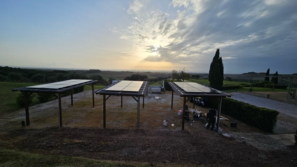 Impianto fotovoltaico carport da 15 kW presso l’azienda agricola Castello del Terriccio. Intervento congiunto con l’installazione di una colonnina destinata alla ricarica dei veicoli elettrici.
